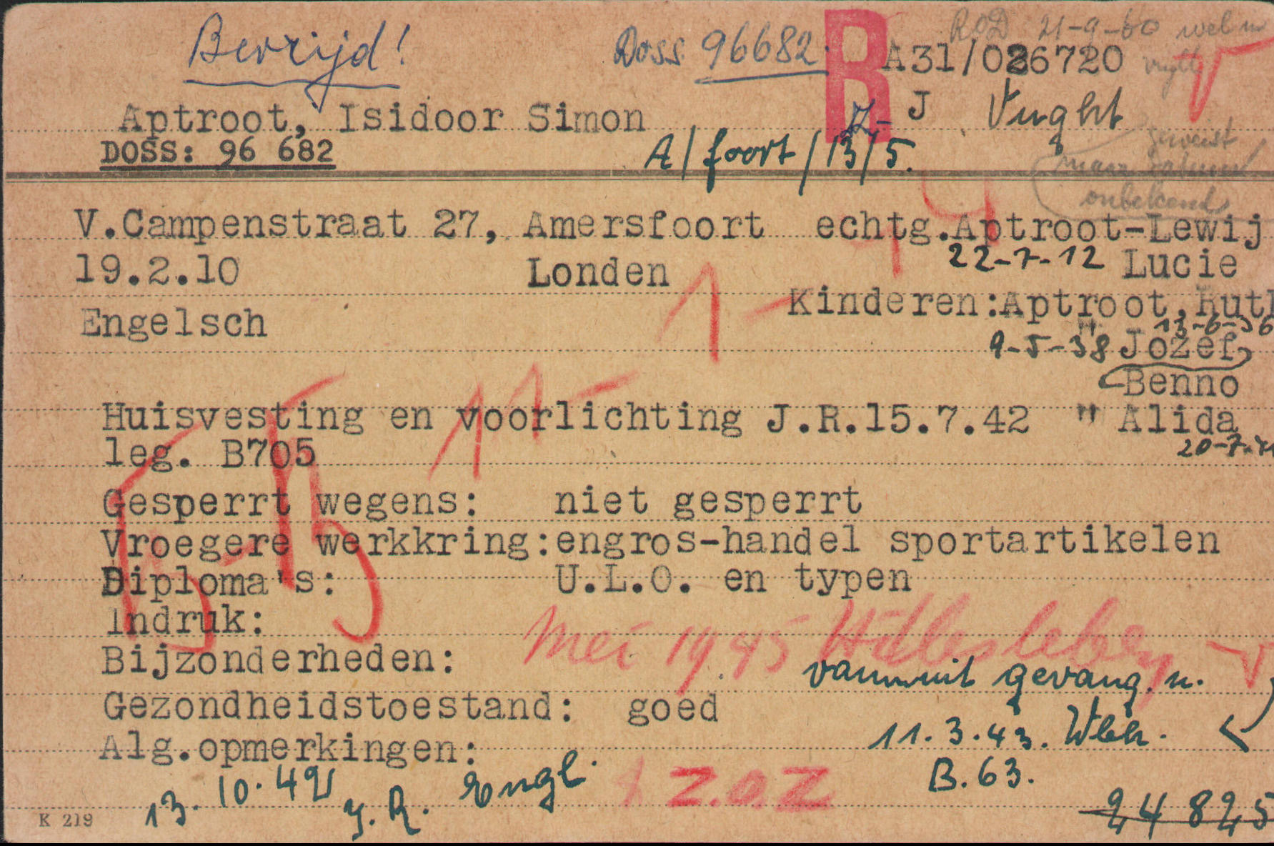 Bevrijd ! zie de link naar de persoonskaart van vader Isidoor Simon Aptroot van de Joodse Raad en de naoorlogse aantekeningen van het Rode Kruis (bron: Archiv Arolsen). Van de andere gezinsleden zijn identieke kaarten aanwezig in Archiv Arolsen.