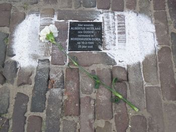 Bij de voordeur van het voormalige woonhuis van de verzetsstrijder Albertus Nicolaas den Ouden, Breestraat 80, werd een herdenkingssteen officieel onthuld door zijn nicht.