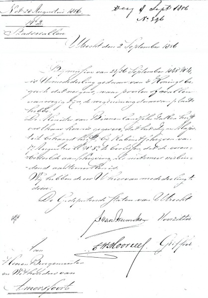 Brief GS 1856. Bron: Archief Eemland, Secretarie archief BNR 002.1, Gemeentebestuur Amersfoort (1811-1945); inv. nr. 368, agendapunt 396.